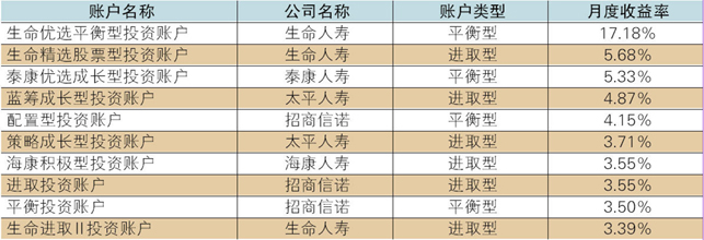 本月,所有投资账户中有124个获得正收益率,其中包括进取型47个、平衡型36个、稳健型16个以及保守型25个。以上四类投资账户的月度平均收益率依次为1.84%、1.77%、-0.45%以及0.10%。月度收益表现最好的10个投资账户中,有进取型6个、平衡型4个,排名首位的是生命人寿的优选平衡型投资账户。(表2)