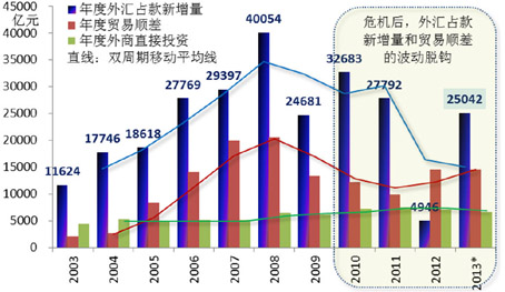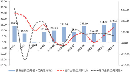 2013年一季度,出口增速达到18.4%,进口同比为8.4%,两者都较2012年下半年出现了好转。主要原因在于,进出口企业利用境内外较大的汇差和利差套利(保税区贸易激增和热钱大幅流入),导致进出口数据虚增。进入二季度,由于出口基数较高、外管局增大对套利贸易打击、全球市场不景气、以及人民币对美元走强等因素影响,出口增速大幅回落,进口增速则受到国内工业生产放缓、原材料进口需求降低的影响而亦明显下滑。三季度以来,美日欧经济持续复苏,以及前期国家出台的一系列稳定进出口增长措施逐步到位,助力进出口增速回升到正常水平。(图2)