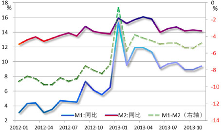 11月M2同比增速14.2%,1-11月累计同比增速为14.2%,与2012年全年14.4%的增速基本持平。