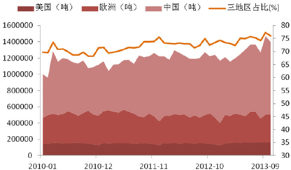 根据WBMS数据,截至2013年10月全球精炼铜消费量为1735.5万吨,较上年同期增加3.3%。其中中国精炼铜表观消费量增长8.6%,至793.1万吨,占全球总需求量的45.7%。同期,美国精炼铜消费增长4.8%,欧洲精炼铜消费仅增0.7%。