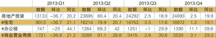 表1 2013年各季度房地产开发投资情况 单位:亿元,%