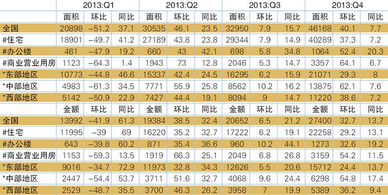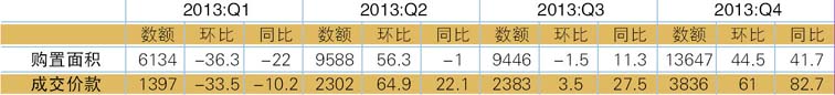 表3 2013年各季度全国土地购置面积与土地成交价款情况 单位:万平方米、亿元、%