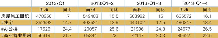 2013年全国房地产施工面积为665572万平方米,同比增长16.1%,增幅比去年同期多2.9个百分点。(表4、5)