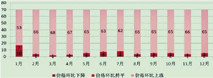图1 2013年70大中城市新建商品住宅环比价格上涨、下降和持平城市个数变化情况