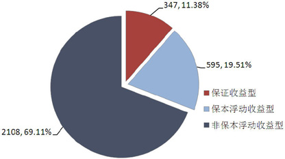 从收益类型来看,保证收益型产品共发行347款,环比减少125款,市场占比上升0.17个百分点至11.38%;保本浮动收益型产品共发行595款,环比减少230款,市场占比下降0.08个百分点至19.51%;非保本浮动收益型产品共发行2108款,环比减少806款,市场占比下降0.08个百分点至69.11%,依然是最主要的产品收益类型。(图1)
