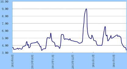 货币市场:上周,央行公开市场共进行两次正回购操作,当周净回笼资金规模1080亿元。市场资金面宽松态势持续,7天质押式回购利率较前周下行99个基点至3.36%。