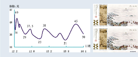 小版张的表现就显得相对弱势,这可以从近几年发行的小版张价格整体下滑中窥得。其中2013年发行的小版张中,就有半数跌破面值,如“第十二届人大”、“桃花”、“景泰蓝”和“中国古镇(1)”小版张即分别成为打折张。唯一令人刮目相看的则是“母亲节”小版张,其在1月末创出100元新高。