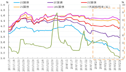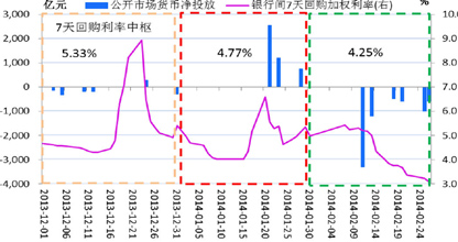 外汇占款方面,如果此轮央行主动干预的人民币贬值在3月份延续,相应央行在外汇市场买入美元卖出人民币,在资本未出现大幅流出的前提下,人民币流动性仍将维持宽松。而且,央行在2013年四季度货币政策报告中再次强调“保持适度的流动性”,央行近期货币政策采取“偏紧”的可能性较小。对3月资金面不利的因素主要为缴税、季末等季节性因素。总体上看,3月资金面走势先松后紧,预计7天回购利率中枢在4.0%-4.4%。