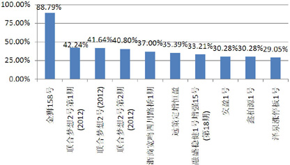 月度收益率前十的产品依然均为股票型产品,中江信托发行的“金狮158号”以88.79%的收益排名第一。(图10)