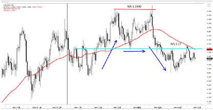 汇率展望:从日线图上可以看出,美元对日元成区间波动走势,但波动区间逐渐收窄,形成三角形态,预计美元对日元将于今年年底前突破形态,并且向上突破的概率较大。这是因为伴随着美国经济复苏态势稳定,美联储将于今年年底结束缩减购债。随着失业率的进一步下降,美联储升息时间亦将再次提上日程,从而支撑美元走高。预计2014年下半年日元的波动区间为【100,106】。(图4)