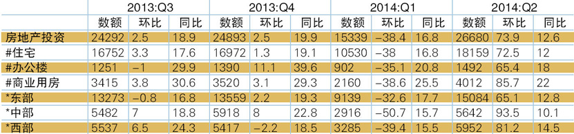 表1 2013年Q3 -2014年Q2房地产开发投资及增长情况 单位:亿元,%