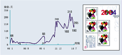 相对来看,2003—2007年发行的小版张则为阴跌走势,尤其是2003年小版张跌势明显,如“羊年”、“百合花”、“民运会”、“篆书”和“晋祠彩塑”多版式小版张分别下滑到220元、160元、68元、165元和72元,“杨柳青”、“网师园”、“图书艺术”、“艾滋病日”和“重阳节”单版式小版张则分别下调至80元、55元、65元、125元和31元附近,而2004年发行的“成语典故”、“司马光砸缸”、“绿绒蒿”、“国旗国徽”和“中国名亭”小版张则分别滑落到30.5元、34元、22元、49元和50元。