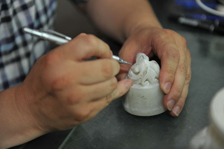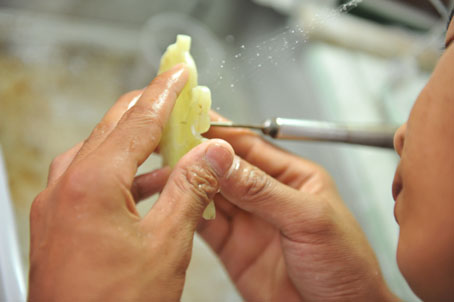 说着话儿,闫楠一直没停下手里的活,她身子向前倾着,一个青海料的仿古香炉在她手里熟练地转来转去,在雕刻机钻头刺刺的响声中不断换着角度,同时反复用水冲刷。这是她每天都要重复的动作。