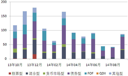 本月,18家证券公司或其资管公司共发行了87款集合理财产品,环比增加45款,增幅107.14%,平均首发目标规模11.25亿元,环比上升1.15亿元,增幅11.42%;债券型产品发行了43款,环比增加9款,增幅26.47%,平均首发目标规模9.71亿元,环比上升0.17亿元,增幅1.77%;混合型产品发行了31款,环比增加26款,增幅520.00%,平均首发目标规模10.77亿元,环比减少9.56亿元,降幅47.03%FOF产品发行了7款,环比增加5款,增幅250.00%,平均首发目标规模1.08亿元,环比上升0.16亿元,增幅16.97%;货币市场型产品发行了3款,平均首发目标规模50.00亿元;其他型产品发行了3款。(图9