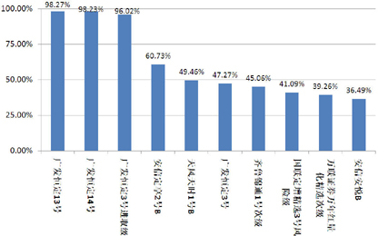 受季末时点影响,本月集合信托市场预期收益率普遍上升:1-2(含)年期限段产品平均预期收益率9.95%,环比上升91.68BP,其中,房地产领域平均预期收益率10.33%,环比上升89.16BP,工商企业领域平均预期收益率10.00%,环比上升111.87BP,基础设施领域平均预期收益率9.99%,环比上升80.05BP2-3(含)年期限段产品平均预期收益率9.95%,环比上升109.00BP,其中,基础设施领域平均预期收益率9.78%,环比上升88.33BP3年以上期限段产品平均预期收益率10.50%,环比上升305.00BP,其中,基础设施领域平均预期收益率10.50%,环比上升200.00BP。(图6