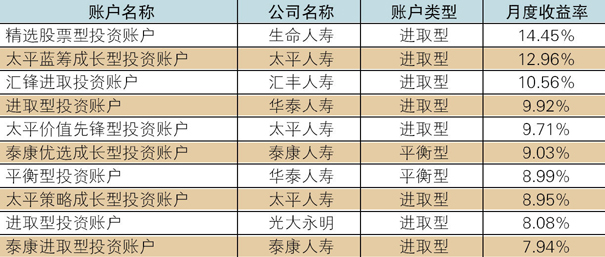本月共有183个获得正收益率,其中包括保守型32个、稳健型57个、平衡型42个、进取型52个。以上四类投资账户的月度平均收益率依次为0.43%1.78%3.81%4.91%。月度收益表现最好的10个投资账户中,进取型8个,平衡型2个,排名首位的是生命人寿的精选股票型投资账户。(表2