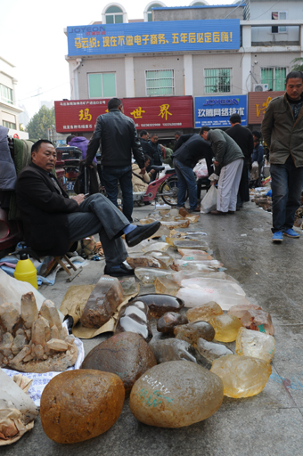 东海县每逢阴历的初八、十八、二十八是水晶大集。水晶城前的街道上摆满了大大小小的摊子,各种各样的石料、造型各异的摆件,五花八门。逢集的这天,不宽的街道会被挤得水泄不通,如果刚好再赶上个周末,更是人头攒动,闲逛的、捡漏儿的,喜不喜欢水晶另当别论,享受这节日般的气氛才是重点。但对于像王立国这样的圈儿里人来说,大集还有着更重要的意义。高手在民间,有好多小作坊的作品会在大集上亮相,没准被喜欢的人见了,就收了,接下来还可能会带来定单,所以,这水晶大集无形中也成了民间高手“斗宝”的舞台。王立国、李彩霞夫妇俩逢集必去,老婆摆个摊子卖货,老公去买石料,也借机看看别人做了什么好东西。