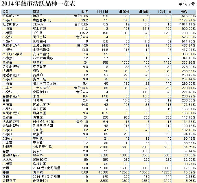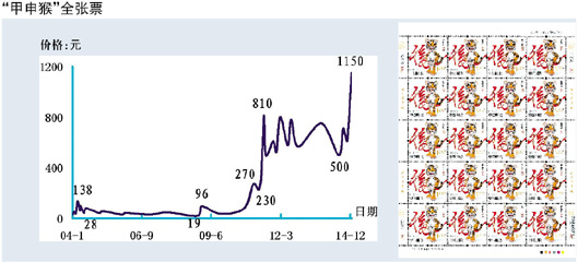 表现一直低迷的小本票板块,在2014年下半年也现萌动,一些近年来发行的新品种在买盘吸纳下呈扬升态势,其中不少品种涨幅同样不小。如八十七神仙卷小本票价格从年初的15元攀升到12月中旬的65元,七仙女刘三姐牛郎织女白娘子神舟载人飞船分别上扬到22元、25元、20元、30元和60元。