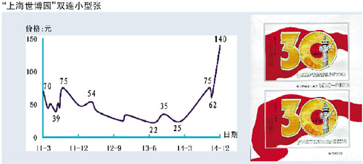 双连小型张是小型张板块中的奇葩,一直是市场的热点,也是2009年牛市中的强势板块,而随着编年小型张的崛起,双连小型张走势更咄咄逼人。12月下旬,洛阳世展无锡亚展邮联六大邮联七大双连张分别攀升到135元、150元、65元和40元,悉尼奥运会改革开放上海世博园十八大双连张也分上扬至300元、100元、140元和59元,与年初价格相比均已出现翻番,其中上海世博园无锡亚展双连小型张最为杰出,全年的涨幅均超过4倍。