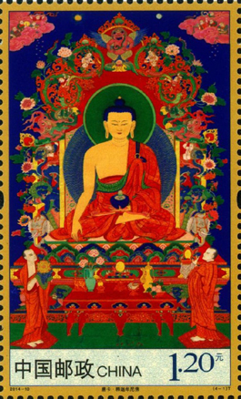 唐卡绘画艺术是西藏文化的奇葩,千余年来影响深远,也是中华民族民间艺术中弥足珍贵的非物质文化遗产。为宣传我国非物质文化遗产,中国邮政于2014518日发行了《唐卡》特种邮票14枚,小型张1枚。该套邮票表现内容分别为:释迦牟尼佛、无量寿佛、绿度母和白度母,小型张则为千手千眼观世音菩萨。邮票图案均系故宫博物院珍藏品。为了突出唐卡的地位,这套邮票采用了较为少见的大规格票幅,再现了唐卡精美之细节,而小型张边饰采用金色与唐卡相关的花纹纹样,增添了整套邮票金彩辉映的奇丽意境和独特性。