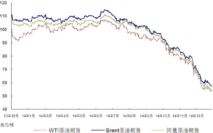 全年各主要原油价格跌幅接近5成,布伦特原油期货自110.9美元/桶跌至57.55美元/桶,跌幅48.1%WTI原油期货自98.7美元/桶跌至53.71美元/桶,跌幅45.6%;中东阿曼原油期货自107.4美元跌至54.24美元/桶;OPEC一揽子原油指导价自107.94美元/桶下调至54.44美元/桶。