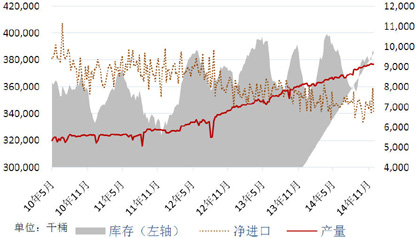 据路透社报道,国储局在3月和4月收储至少20万吨保税区仓库中的进口铜。因此2014年前11个月虽然累计进口327.4万吨,同比增加13.17%,但其中部分进口可能并未进入实体经济消费,精炼铜市场存在部分虚增需求。