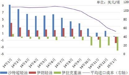 中国被视为此次油价大跌的最大受益国。由于OPEC各国为保障出口份额,大幅下调了出口定价升水——特别是对亚洲地区的出口价。据观察,20151月份沙特、伊朗、伊拉克向亚洲出口原油的升水较2014年同期分别减少了95.764.8美元/桶,因此我国原油进口成本价的降幅较原油期货价格降幅更甚。