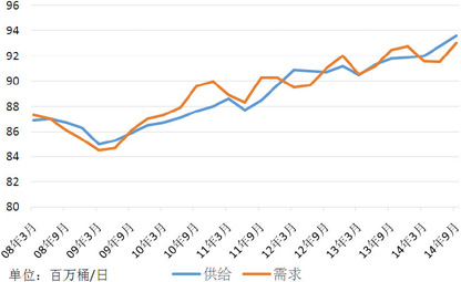 需求方面,鉴于美国经济复苏势头较强,中国经济逐渐适应新常态,启动微刺激政策,低油价也有助于激发能源、化工消费,我们认为未来数个季度原油需求将保持2014年下半年的增长势头,2015年全球原油需求将达到9300-9350万桶/日水平。