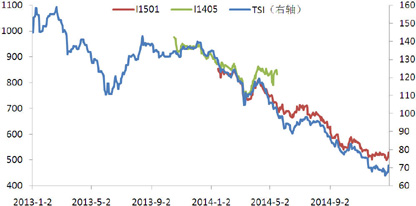 中国大连商品交易所铁矿石期货与TSI的走势高度相关,以I1501合约为例,116日为该合约首个交易日的收盘价为853/吨,此后铁矿石I1501期货合约价格持续震荡下行,并于4月中旬至6月中旬、8月中旬至9月底期间加速下跌,四季度呈现弱势震荡格局,年底收盘于526/吨,下跌38.33%
