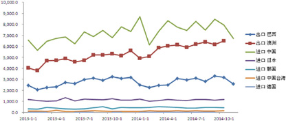 2014年,世界铁矿石贸易保持着南矿北运的基本格局。澳大利亚和巴西继续把持着全球铁矿石出口量前二名的交椅,中国仍然是最大的铁矿石进口国,第二大进口国日本则继续保持一亿多吨的铁矿石年进口量。
