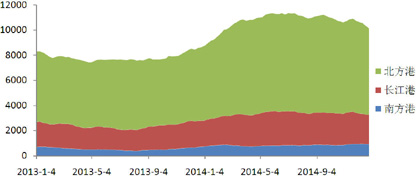 2013年二、三季度降至阶段性低位后,国内港口铁矿石库存量就持续增加,2014年春节后首周便突破亿吨。根据钢之家(Steelhome China)的统计,74日当周的港口铁矿石港口库存达到创纪录的11,360万吨(不含印度矿125万吨)。虽然下半年港口库存量有所下降,但仍始终保持在亿吨以上的高位。截至20141226日当周,港口铁矿石库存总量达到10,155万吨(不含印度矿125万吨),分别集中在北方港口6,895万吨,长江港口2,335万吨,以及南方港口925万吨。