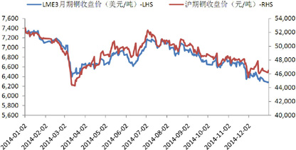 2014年伦铜市场开于7389.5美元/吨,年末收于6284.25美元/吨,最高价7460美元/吨,最低价6230.75美元/吨,下跌14.96%。沪铜走势大体与之一致,开于52290/吨,收于45800/吨,最高价52770/吨,最低价43690/吨,下跌12.41%