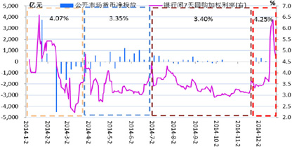预计2015年的资金面仍将维持整体宽松的格局,全年的回购中枢将继续下移,央行仍将通过公开市场操作以及MLFSLOPSL等多种政策工具呵护资金面,全年资金的波动性也将有所降低。而且随着美元走强外汇占款减少,通胀压力显著降低,存款保险制度正式推出,央行使用更长期的政策工具向市场提供流动性的动力也在增强,全面降准的可能性仍然存在,但时点和力度存在不确定性。2014年年末的降息对于社会融资成本下降的引导作用仍然不太显著,央行再次降息的可能性也不能排除。另一方面资金面可能受到阶段性地受到包括节假日取现、税收集中上缴、新股IPO、年末季末时点效应等负面因素的冲击出现阶段性紧张,仍须引起注意。