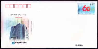 为纪念中国建设银行成立60周年,中国邮政于2014年12月30日发行《中国建设银行成立60周年》纪念邮资信封,全套1枚,面值1.2元,售价1.6元,发行量200万枚,编号JF115。此枚邮资封的邮资图案主图采用“建行”60周年行庆徽志,邮资封左下方的主图背景为建行总行大楼——北京信达金融大厦,背景图案则以《中央人民政府政务院关于设立中国人民建设银行的决定》公告为衬,下方是海蓝的“建行”LOGO及黑色立体中英文标准行名。邮资封背面分别用中英文对“建行”60年来的作用进行了简要介绍。