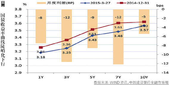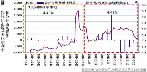 2015年一季度资金面较去年四季度整体偏紧,7天回购利率季度中枢为4.41%,较去年四季度的3.54%上升87bps。今年1月份7天回购利率中枢为4.01%2月份较1月大幅上升64bps4.65%3月份较2月小幅上升5bps4.70%。我们认为7天回购利率呈现逐月抬升走势的原因主要有以下三方面:一是1月扰动因素较少,而2月和3月扰动因素相对较多。二是央行推出的多项宽松政策力度有限,市场预期愈发趋于谨慎。三是人民币贬值预期增强,外汇占款下降带来的影响。总体来看,今年一季度资金面整体持续偏紧。(图2