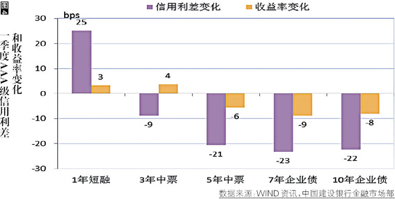 一季度高评级信用债(相对金融债)利差多收窄。因AAA1年短融的流动性明显低于政策性金融债,在一季度总体资金面未达市场预期的情况下,1年短融信用利差扩大为25bps。对中长期限,由于政策性金融债收益率上行幅度明显超过AAA级信用债,信用利差明显收窄。3年中票、5年中票、7年和10年期企业债的信用利差分别收窄9bps21bps23bps22bps。总体而言,长期限的信用债流动性不佳,因此市场需求多集中在中短端,加上资金面未达市场预期,对中短期品种的做空力量较大,导致中短期品种的信用利差上行幅度大于长期。(图4