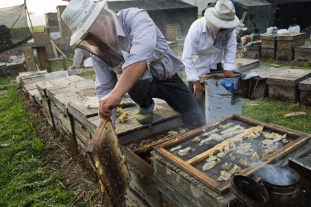 采蜜是养蜂人一天中最重要的工作,当然也是最幸福的时刻。辛勤的劳作后终于看到了收获。采蜜开始后,张师傅从选择的蜂箱中小心翼翼的抽出巢脾,然后用细软的毛刷轻轻拂去还停留在蜂巢上面的蜜蜂,再交由身旁给他帮忙的岳父。老人家把巢脾插进摇蜜机,摇动把柄,利用离心力把蜂蜜从蜂巢里甩出来收集到桶里。就在这当口,附近村庄的村民闲逛到蜂场,张师傅忙掰了一大块饱含蜜汁的新鲜蜂巢请他品尝。香甜的滋味让这位不速之客直咂吧嘴。随后,张传谦把巢脾上一些形状不规则的蜂巢用小铁钎铲下来收集到一起,用喷烟器驱走逗留的蜜蜂,放到锅里再熬成蜂蜡。喷烟器里装的是加工蜂蜡时形成的渣滓,既无毒无害,驱蜂效果又好。粗加工成形的蜂蜡是紧俏货,会有人定期上门收购,经过进一步的深加工,被用来提炼应用于军工制造和美容护肤品生产的辅助原料。