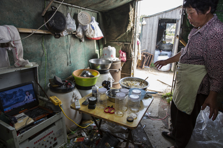 蜂场一角,就地搭建的简易帐篷就是张传谦一家歇脚煮饭、夜里值班和放置家活什的地方。一台折叠式电视机是最重要的电器,靠它提供气象预报和在雨天里消磨时间。帐篷里的用电是靠摆在外边地里的一块太阳能电板提供的。一天里,张传谦要几次对它的朝向做调整,好让它总是正对着太阳。今年本地阴雨天多,蜂蜜的产量和质量都不太理想。虽然如此,只要是天不下雨,一家人每天的活得从天亮忙到天黑,简直完全跟蜜蜂一个节奏。