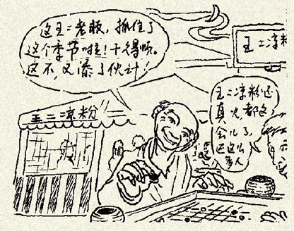 凉粉销售受季节影响。夏天生意最好,食客络绎不绝。因为客人多,所以,王二就在大堂多雇了几个跑堂的。