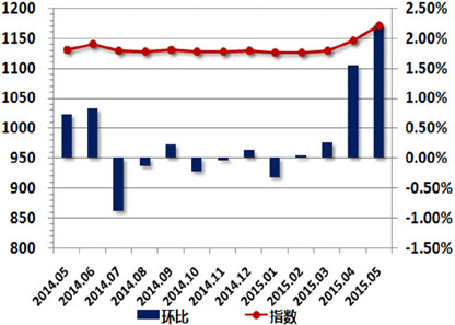 另,中国房地产测评中心最新发布的228指数显示,2015年5月,深圳一手房价格指数为1172.4点,较上月上升25.3点,环比上涨2.21%,涨幅较上月扩大0.66个百分点,同比上涨3.67%。(图1、图2)