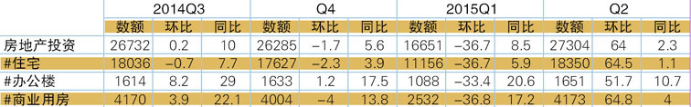表1 2014Q3-2015Q2房地产开发投资及增长情况 单位:亿元,%