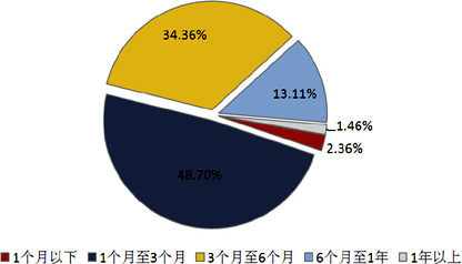 从投资期限来看,1个月以下产品发行139款,环比减少1款,市场占比下降0.16个百分点至2.36%;1-3个月产品发行2863款,环比减少39款,市场占比下降3.56个百分点至48.70%;3-6个月产品发行2020款,环比增加281款,市场占比上升3.04个百分点至34.36%;6-12个月产品发行771款,环比增加70款,市场占比上升0.49个百分点至13.11%;1年以上产品发行86款,环比增加15款,市场占比上升0.18个百分点至1.46%。(图3)