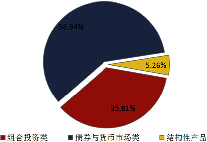 从投向类型来看,债券与货币市场类产品发行3465款,环比增加59款,市场占比下降2.40个百分点至58.94%;组合投资类产品发行2105款,环比增加211款,市场占比上升1.70个百分点至35.81%;结构性产品发行309款,环比增加56款,市场占比上升0.70个百分点至5.26%;融资类产品仍然没有发行。(图4)
