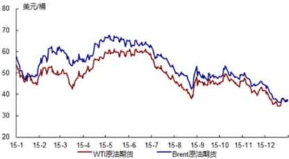 2015年初,国际原油承接2014年下半年快速下跌走势,1月份继续下探新低,至45美元/桶左右。1月末至5月份,油价展开一波中级反弹,最高至65美元/桶上方。但供大于需的基本面压力没有改善,反弹延续性不足,7月起加速下跌,刷新新低位置,接近40美元/桶。9-10月窄幅盘整,年末再度下滑至35美元/桶,以接近年内最低点位报收。(图1