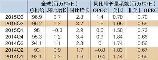 虽然2015年全球原油需求大涨约两百万桶,但供给增长近三百万桶,导致供大于需缺口继续扩大。供给结构特点是:增长的主力棒在二季度后由美国移交至OPEC——美国原油产量增速自二季度下滑,7月份之后周产量逐渐下滑,与此同时OPEC产量明细扩大;非美国、非OPEC以外地区微增,且增幅稳定,主要是俄罗斯、加拿大、中国、墨西哥等国。(表1
