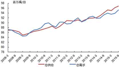2016年,一方面全球经济复苏,尤其是美国的经济增长将会延续,中国增速放缓但不会发生断崖式危机;另一方面,中国政府2014年末多次上调消费税,2015年末取消油价下调机制,不鼓励利用低油价扩大油品消费,虽然2015年末出台小排量汽车购置税减半利好政策,但主要目的是提振基础工业和居民大宗消费,对原油消费作用较小。所以,我们判断,低价格边际效果递减现象明显,当前价格已经激发了大量潜在油品消费,即使价格再降,可供挖掘的消费力量不多,预计全年需求将增长150万桶/日,至总量9625万桶/日,需求增速不可能超过2015年。