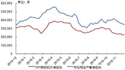 近一年半来,远期升水的特点是下跌速度越快,升水幅度越大。但这一特征在2015年末弱化。1月、7月、12月油价均加速下跌,观察6个月期限的远期升水(6个月后的合约减即期价),1月份最多达5美元/桶,7月份达7美元以上,但12月基本在3美元左右。远端价格不再强势,一方面说明市场对价格迅速反弹期待已减弱,预期油价将低位徘徊较长时间;另一方面,远端卖出收益减弱,生产商套保效果打折,也会加速高成本生产商出局。从空头套保头寸来看,2015年二季度是反弹高峰期,也是多数空头套保头寸建仓之时,年末套保头寸已下降了近一半。(图3