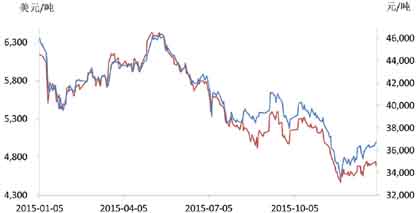 2015年,伦铜市场开于6273.5美元/吨,收于4689美元/吨,最高价6481美元/吨,最低价4443.5美元/吨,下跌25.38%。沪铜走势大体与之一致,下半年价格较伦铜坚挺,开于45500/吨,收于36560/吨,最高价46390/吨,最低价33220/吨,下跌19.86%。(图5