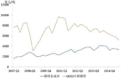 铜矿产能利用率在2013年到2014年间达到高位,并在近一年多小幅下滑,主要原因是铜价下跌大幅侵蚀矿企利润,造成部分高成本的矿企减产、停产。然而,铜价距平均现金成本仍有距离,大部分企业愿意维持生产,保证企业运营现金流。