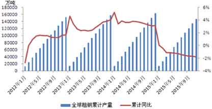 3.汽车行业今年产量增速呈现明显V字形,然而全年仍不及去年同期。2015年前三季度车市低迷,101日国家出台1.6升及以下排量乘用车实施减半征收车辆购置税优惠政策,对市场起到了明显刺激作用,四季度单月销量创新高。2015年前11个月全国累计生产汽车2183.1万辆,同比下降5.16%